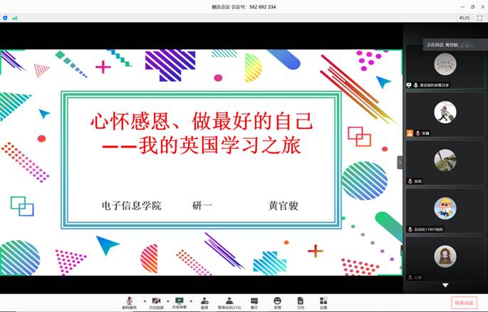 第二部分由研究生代表黄官骏,本科生代表杨孝彬、张文博为同学们分享抗疫故事。黄官骏同学主要和学弟学妹分享了在英国交流学习的感受以及在疫情期间辗转回国的经历,他深刻体会到国内外抗击疫情的差别,怀揣一颗感恩之心感谢祖国母亲及工口漫画