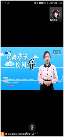 同学统一以班级组织网络会议的形式进行全院线上同期直播观看,真正做到了全员参与,共同学习,同上一堂课。会议内容分为两大部分,分别为一分钟的“套路贷”剪纸艺术短片,艺术短片的制作无不使原本难以接收的“套路贷”知识,以一种生动形象的动画形式展现出来;第二部分 是35分钟的“远离非法校园贷”讲座,专题授课直击要点,使同学们有如拨云见雾,醍醐灌顶。