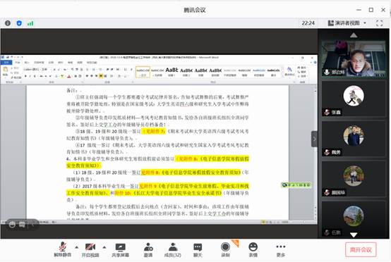 会议工作第三项,艾林负责牵头完成,年级辅导员、各班主任负责执行的关于期末学生班级工作,要求全体班主任班内召开班会并强调5项工作:1、安全教育通报;2、强调“远离非法校园贷”、 “预防艾滋病”、“预防宿舍火灾”和“预防电信与各类诈骗”并承诺签字;3、强调考风考纪;4、疫情防控宣讲;5、做好离校登记。