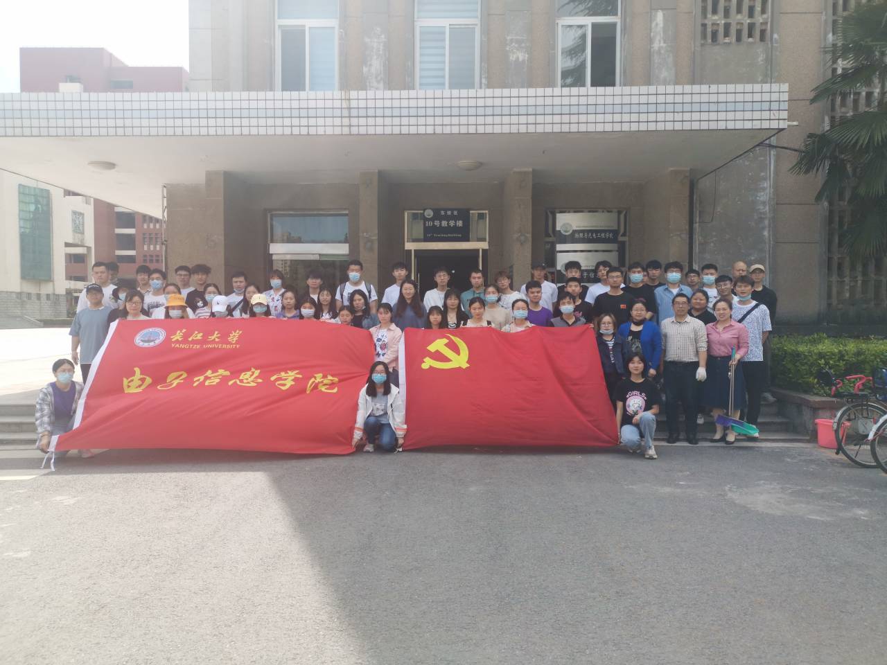 机关的全体老师和学生党员在10号教学楼开展文明校园大扫除活动。
