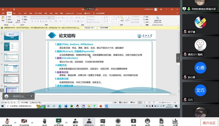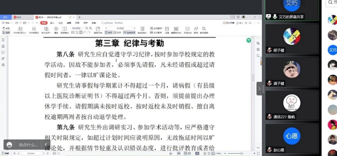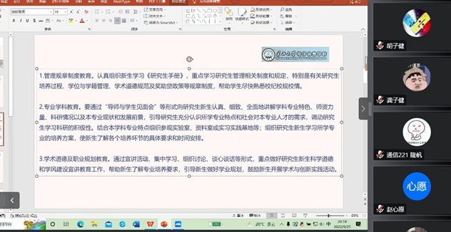 召开了2022级研究生新生入学教育,基于疫情防范等原因考虑,本次会议线上举行,未返校的同学通过腾讯会议同步参会。出席本次班会的有辅导员康玮,2020级研究生学姐艾巧,2020级研究生学长李问周以及全体2022级研究生新生。会议由艾巧主持。