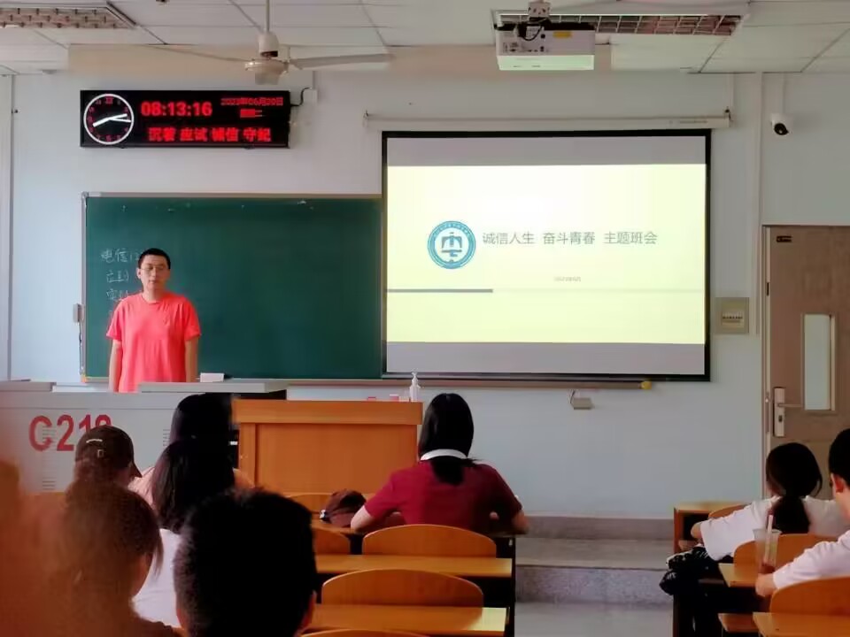 一、二年级诚信教育主题班会。各班级主题班会活动形式多样,主要通过召开学风建设教育、法纪教育和反诈等安全教育班团会,组织诚信宣传教育通过讲故事、讨论、观看宣传片播放PPT等形式。