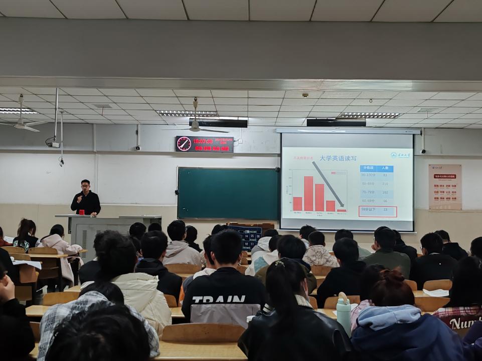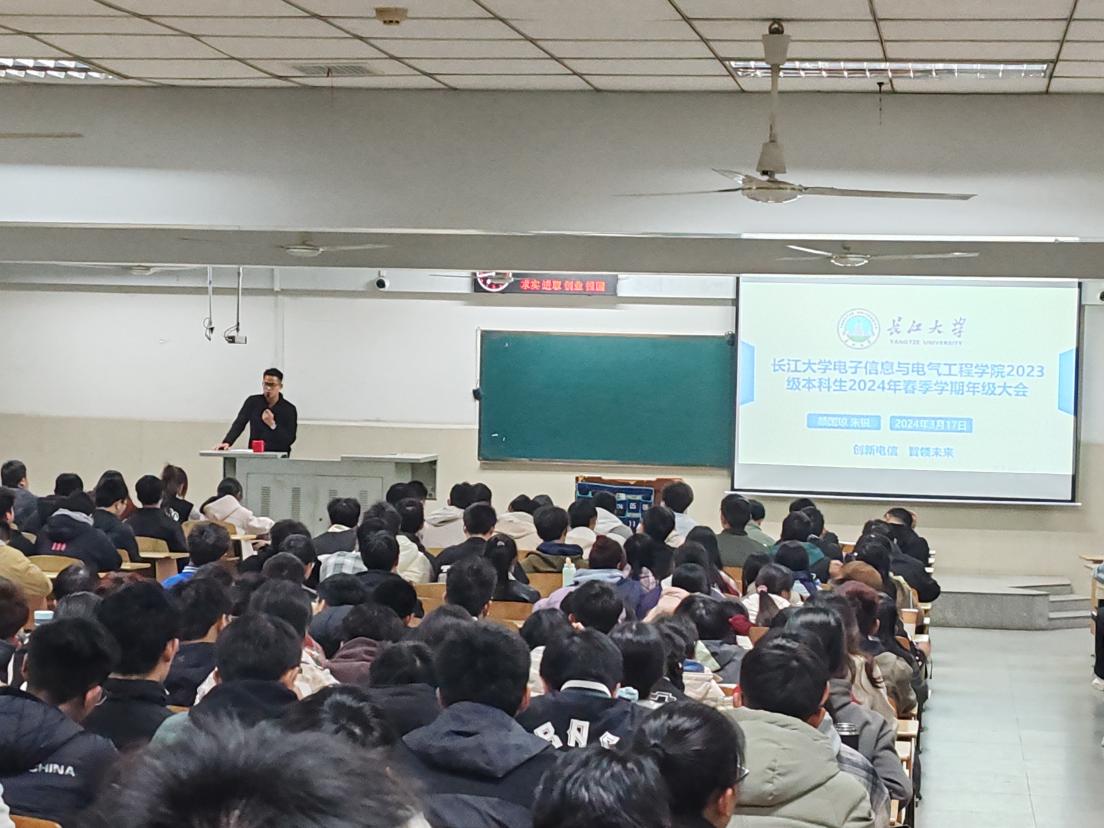 于3月17日晚召开2023级本科生春季学期年级大会暨英语四级动员会,辅导员朱锐老师、学工办主任颜国琼老师及2023级全体本科生参加大会。