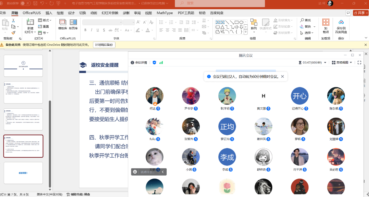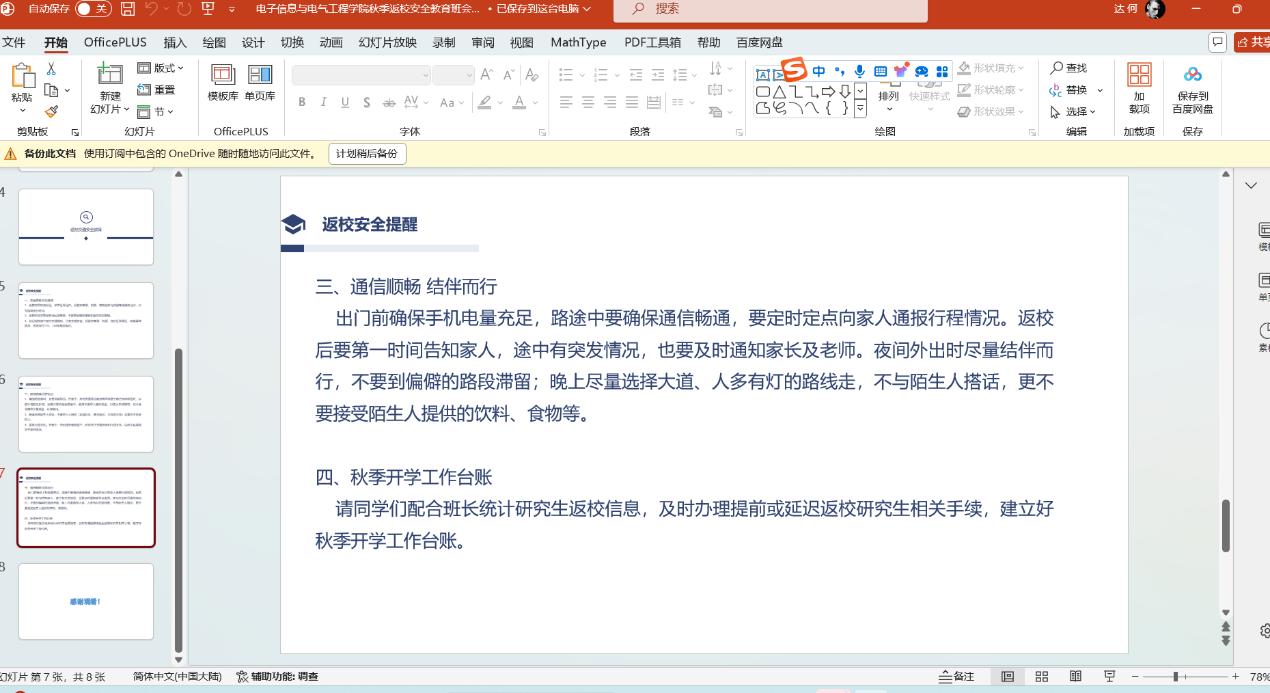 为确保我校秋季学期开学工作平稳有序,根据工口漫画 党委学生工作部、党委研究生工作部《关于开展2024年秋季开学前主题班会的通知》的要求,工口漫画 于2024年8月20日至8月22日期间召开了研究生的开学安全主题教育班会。 本次主题班会主要围绕新生开学线上报到流程及注意事项;学生来校前安全教育(消防、交通、人身、财产安全,防诈骗、溺水、校园欺凌、毒品等),加强网络文明建设教育;秋季开学学生报到返校要求、开学上课、补考注意事项等几个方面开展教育。 (审核 康玮 编辑 康玮)
