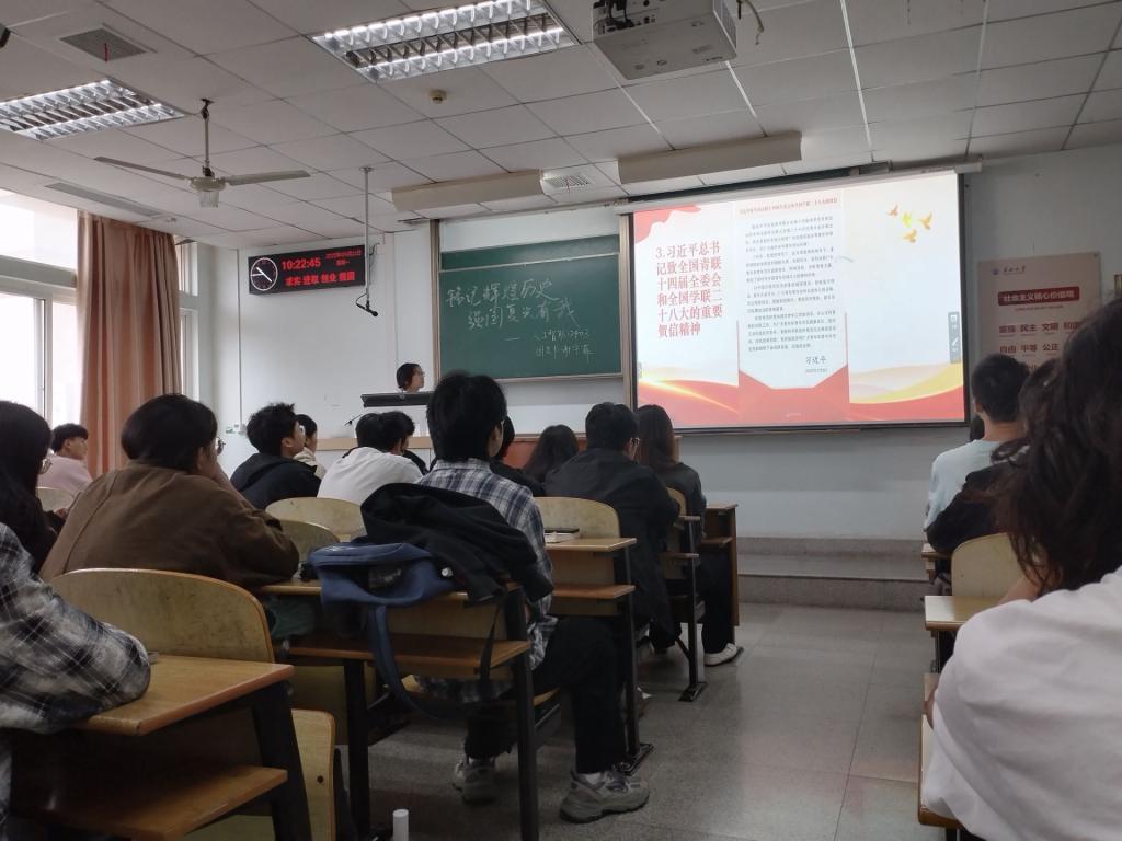 带领团员学习习近平总书记致全国青联十四届全委会和全国学联二十八大的重要贺信精神,梳理历史脉络与时代价值。谢宇菲引导团员铭记历史、缅怀先烈、凝心聚力、奋发图强,坚定捍卫国际公平正义的使命担当,深刻认识中国共产党是中华民族伟大复兴的中流砥柱,以实际行动坚定捍卫“两个确立”、坚决做到“两个维护”,并结合社会主义核心价值观深化思想认知。