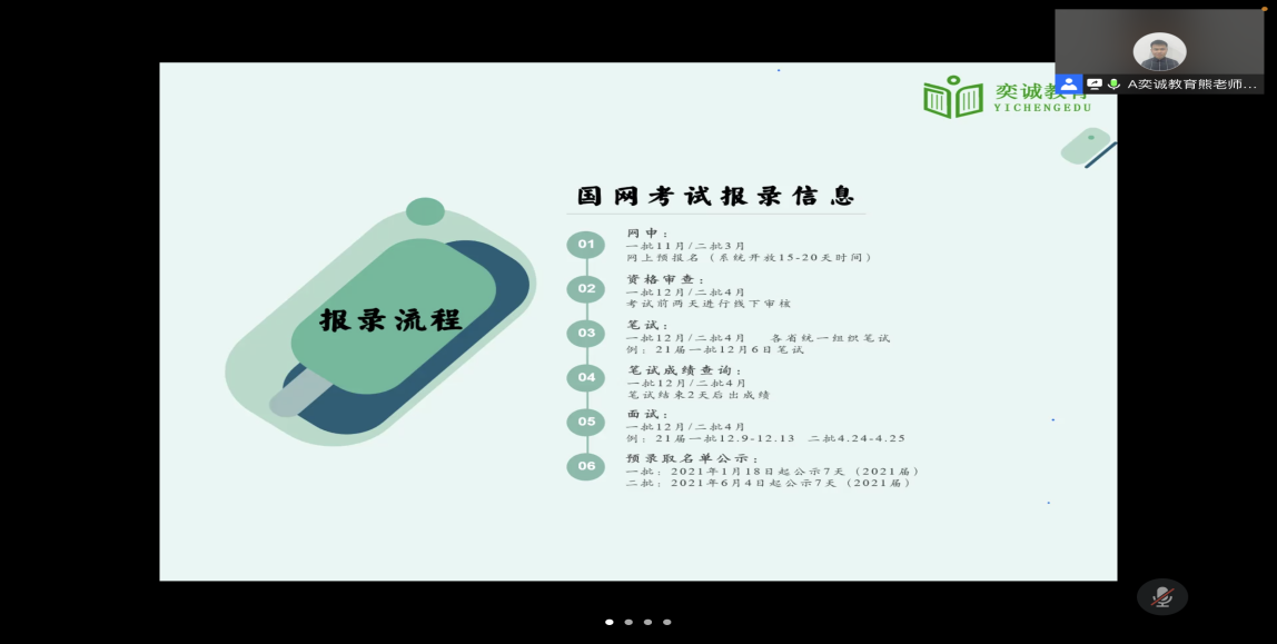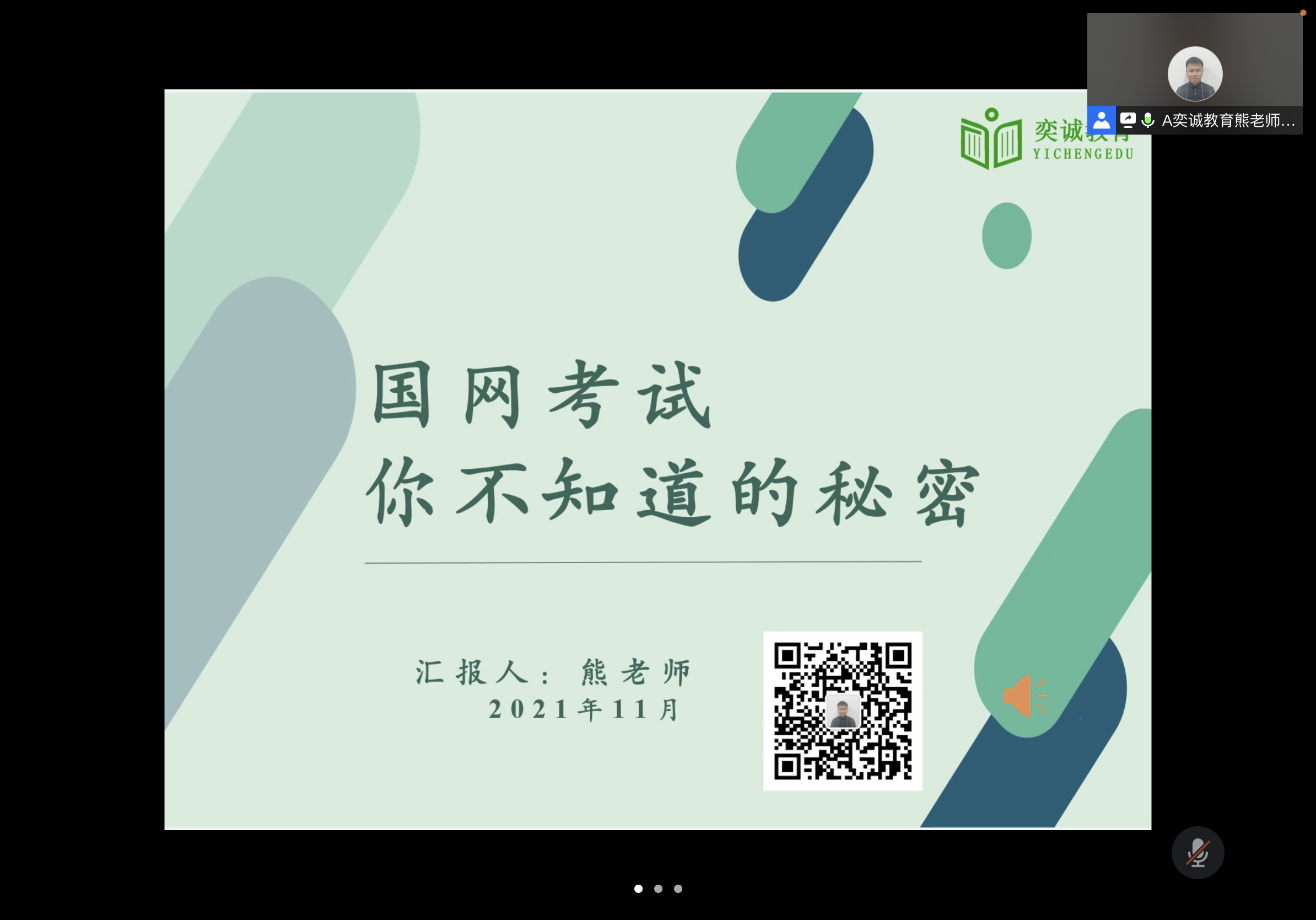 于12月5日晚20:00通过线上腾讯会议的方式开展了“国网考试——你不知道的秘密”国家电网备考攻略主题讲座,本次讲座邀请了来自奕诚教育具有丰富的国考培训教育经验的熊军老师担任此次会议的主讲人,19级、20级电气专业学生参加此次主题讲座。