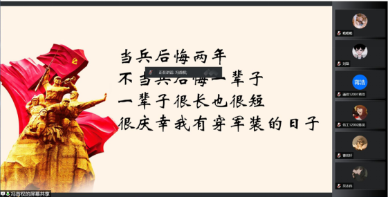 组织召开线上大学生征兵宣讲会,2020级、2019级、2018级部分本科生参会。会议邀请了谭帅和冯首权两位优秀退伍学生进行宣讲。会上,谭帅从应征条件、征兵流程、优待政策和体检常见问题等多个方面进行讲解,对退役复学后学校相关政策做了详细介绍;冯首权则结合自身入伍经历,分享入伍体会,他呼吁广大青年学子要切实增强自身的责任感与使命感,自觉将个人理想与国家发展相结合,用热血与青春书写无悔人生。