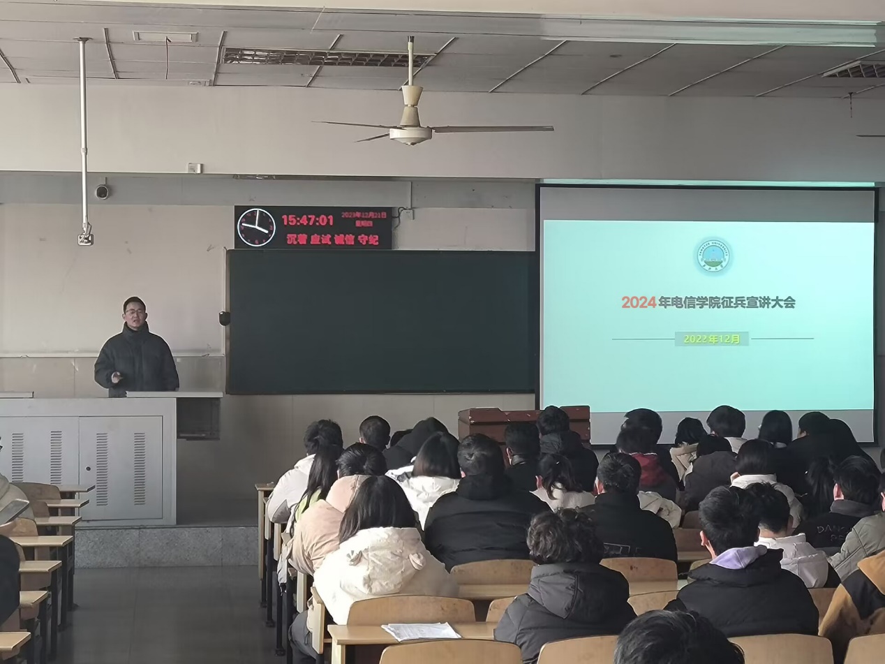 于12教302室召开2024年春季征兵宣讲大会,大会邀请2020级退役大学生士兵周丽军宣讲,会议由征兵专干沈马锐老师主持。