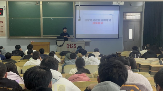 在13教D124教室开展“国家电网招聘考试政策宣讲和备考技巧专题讲座”,讲座邀请到弈诚教育具有丰富国网考试培训教育经验的老师担任主讲人。