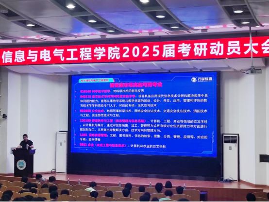 2025届本科生考研动员大会在12教405报告厅举行。副院长魏勇、党委副书记张晨露、海文教育湖北分校高级巡讲师涂光华及2021级全体本科生参加会议,大会由辅导员李蒙老师主持。