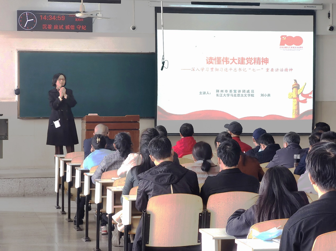 党委书记刘小燕老师担任主讲人。刘小燕书记围绕伟大建党精神的历史渊源、科学价值、时代价值三个方面进行分析读懂伟大建党精神。首先通过“重视历史教育是中国共产党的优良传统”、“学史明理、增信、崇德、力行”以及“启智润心,汲取智慧和力量”这三点得出结论读懂伟大建党精神“正当其时,十分必要”。随后又通过伟大建党精神的丰富内涵明确指出伟大建党精神是中国共产党人精神谱系的源与本、根与魂。最后刘小燕通过伟大建党精神的时代价值讲到当下全党正在深入学习领会习近平“七一”重要讲话精神,但最重要的是要带着感情学,联系实际学,学出共产党人的定力,学出中华民族的豪情,学出对百年辉煌的景仰,学出对面向未来的信心。只要各行各业都能学有所思而不浅尝辄止,学有所悟而又知行合一,“十四五”规划一定能开好局、起好步,全面建成社会主义现代化强国的目标一定能够实现。社会主义没有辜负中国,中国也永远不会辜负社会主义!