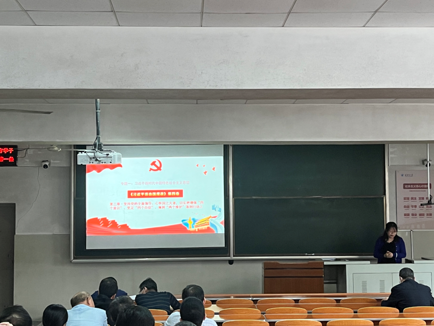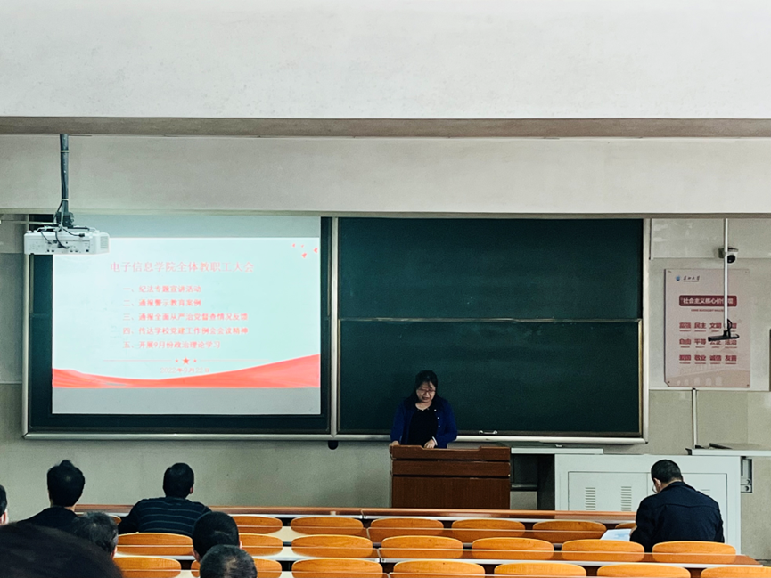 在主教108召开全院教职工大会并开展本月教职工政治理论学习。会议由分党委书记刘逸主持。