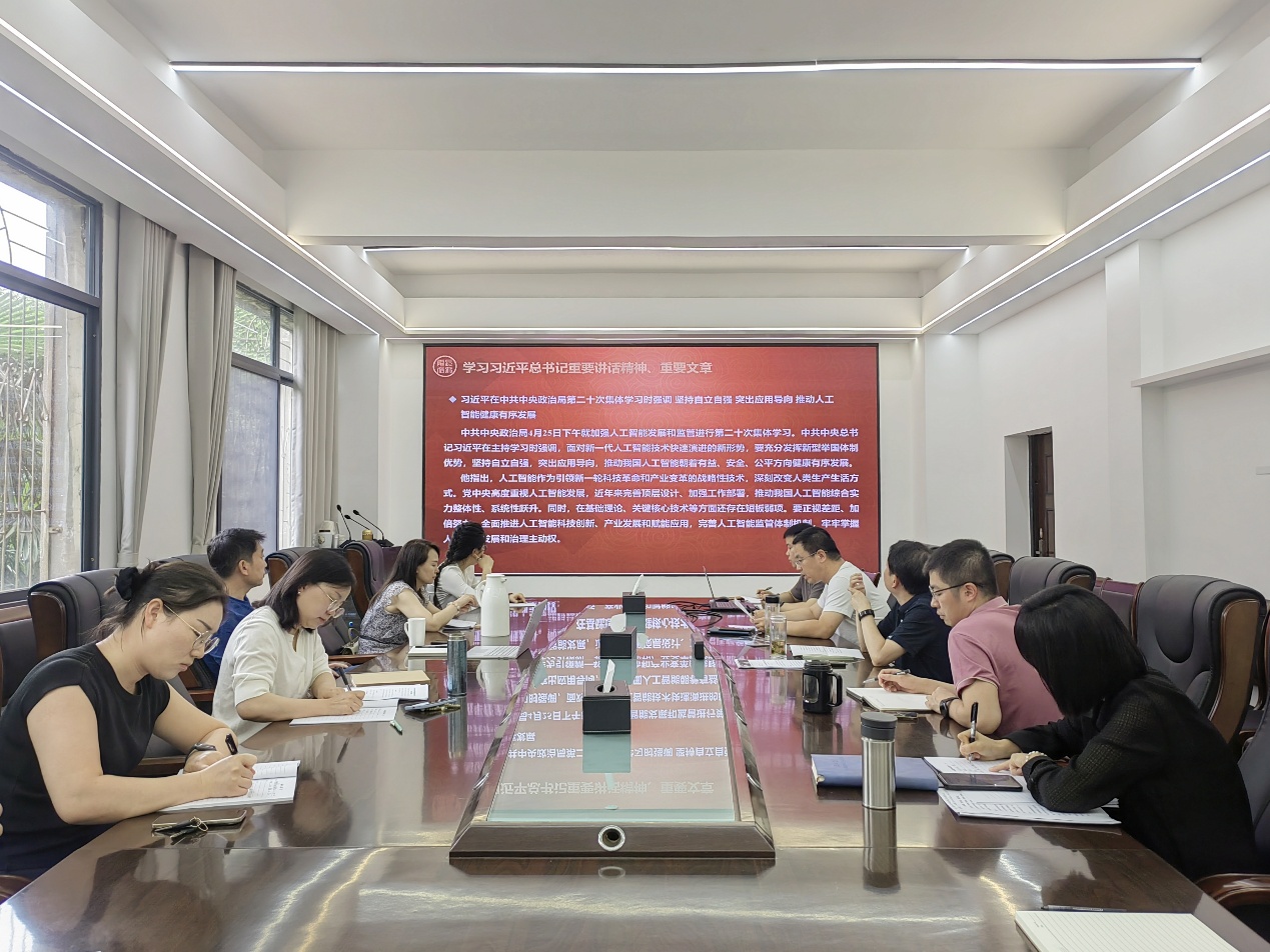 蒋涛领学了习近平总书记在中共中央政治局第二十次集体学习时的讲话精神,习近平总书记强调,要坚持自立自强,突出应用导向,推动人工智能健康有序发展。张晨露传达了刘勇胜校长在学校年轻干部培训班上的讲话,围绕如何贯彻“四个更加”,实施“六大行动”,实现“六个倍增”“四个突破”,构建“六项机制”、强化“六种意识”等方面传达了要求。