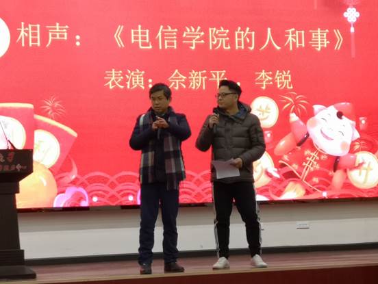 近四年入职教职工表现抢眼,他们给大家呈现了不同的节目类型,例如王齐禄、何小英、胡林等教师分别表演了流行单曲、笛子独奏、舞蹈等节目;同时佘新平、杨顺辽等老教职工也毫不逊色,分别表演了相声和民歌独唱等精彩节目。