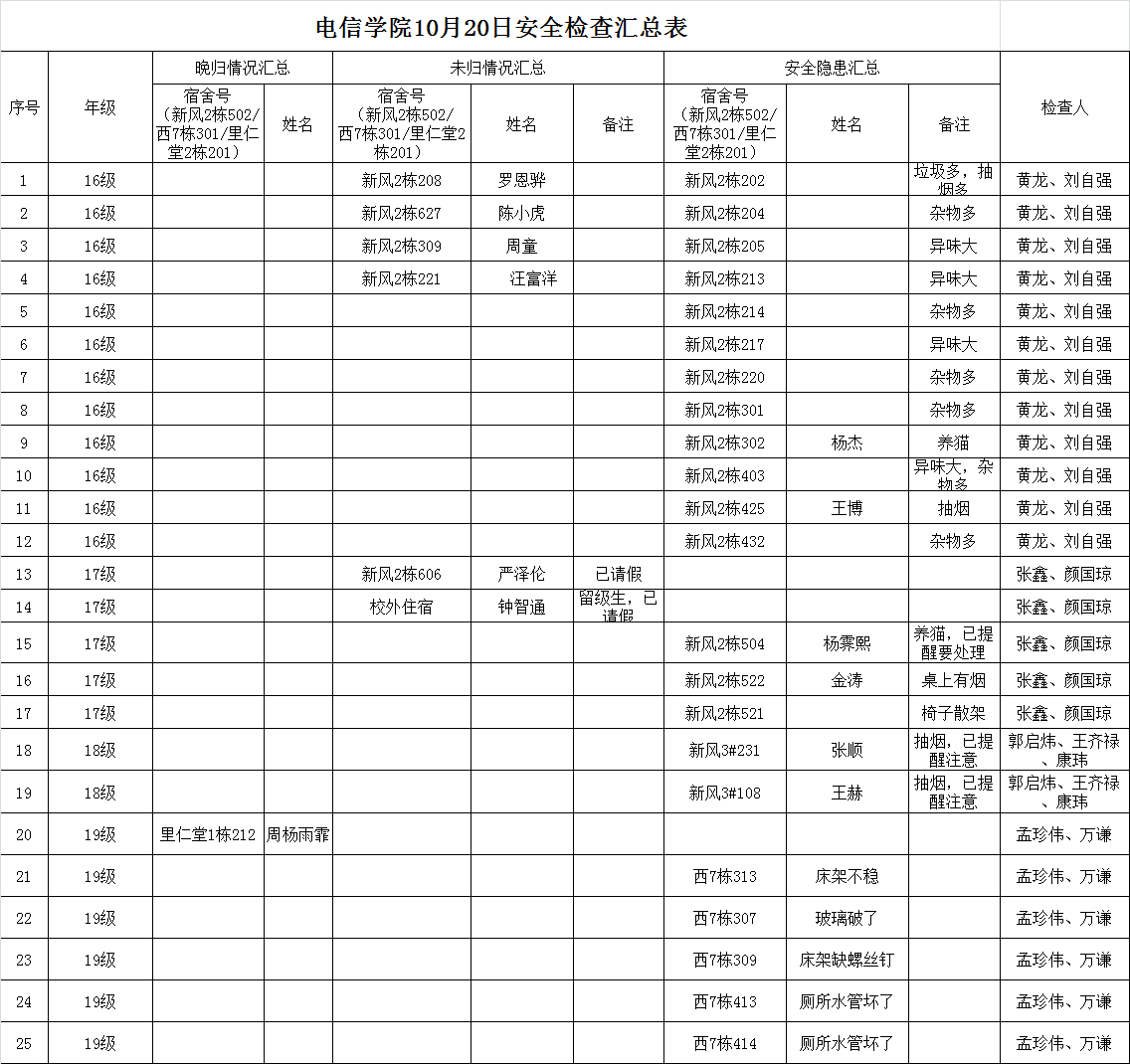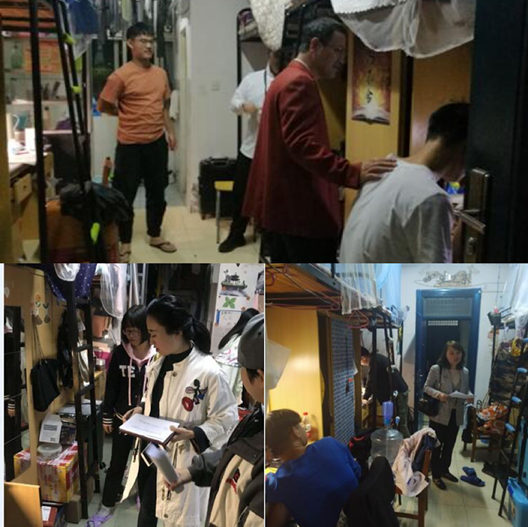 检查分为5个小组开展,每个年级辅导员为第一责任人,检查的范围覆盖全院学生宿舍。检查的重点是学生晚归、夜不归宿和安全隐患。检查过程中,郭书记仔细了解同学们生活中遇到的困难,告诫大家一定要注意用电安全、财务安全和外出的安全,对未归寝的同学的去向仔细询问,并要求年级辅导员立刻与未归寝同学取得联系,获知去向。