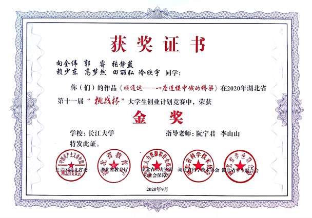 经济11701班的郭睿等7名同学组成了“开创者”团队,向全伟担任队长,张静蓝担任主答辩人,并邀请了阮宁君、李山山老师来做他们的指导老师。刚好他们几位同学在参与老师的一个科研项目,在阮老师的同意下他们选择了一个专题——《顺通达——一座连接中俄的桥梁》,对它进行了深入研究并写成了创业计划书获得了湖北省金奖。