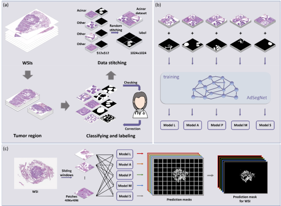 该研究首次对肺腺癌组织病理图像进行像素级别的分类,通过数据集标注、数据集扩增、神经网络设计以及模型指标对比分析等实现肺腺癌组织病理图像自动分类(图1)。论文提出了一种数据拼接方法,其基本思想是使用最少的人工标注数据量满足模型的理想状态。该研究提出了一个用于肺腺癌组织病理图像的分析框架,可在像素级别上智能标注肺腺癌的组织学模式。该框架包含五个深度神经网络模型分支,用于分割各个组织学模式。这项研究使用深度学习技术对肺腺癌组织学模式进行像素级分类,以辅助病理医生判断肿瘤分级,能够有效提高肺腺癌病理诊断效率。