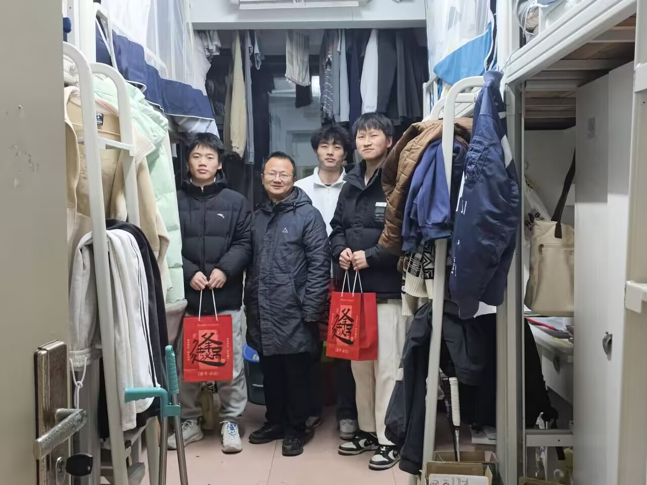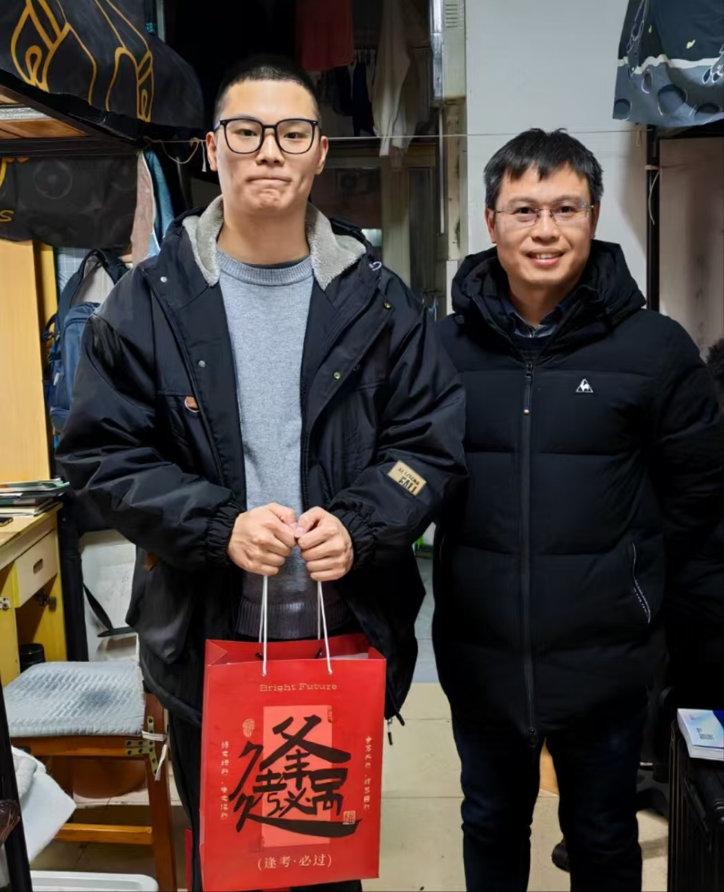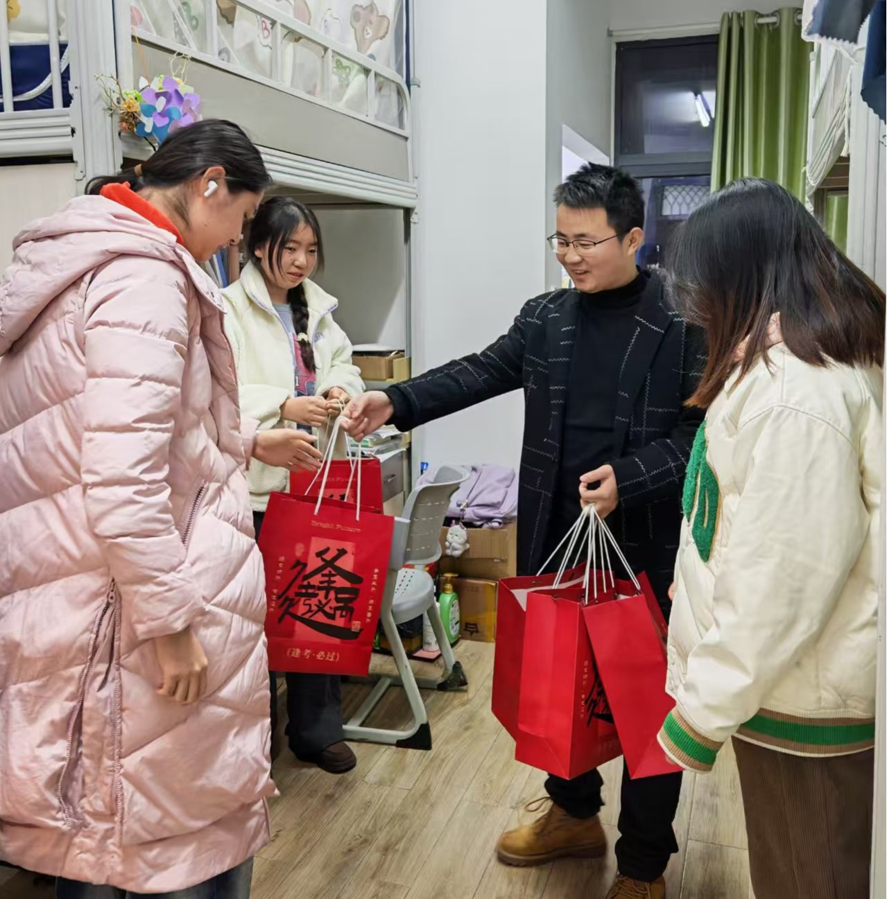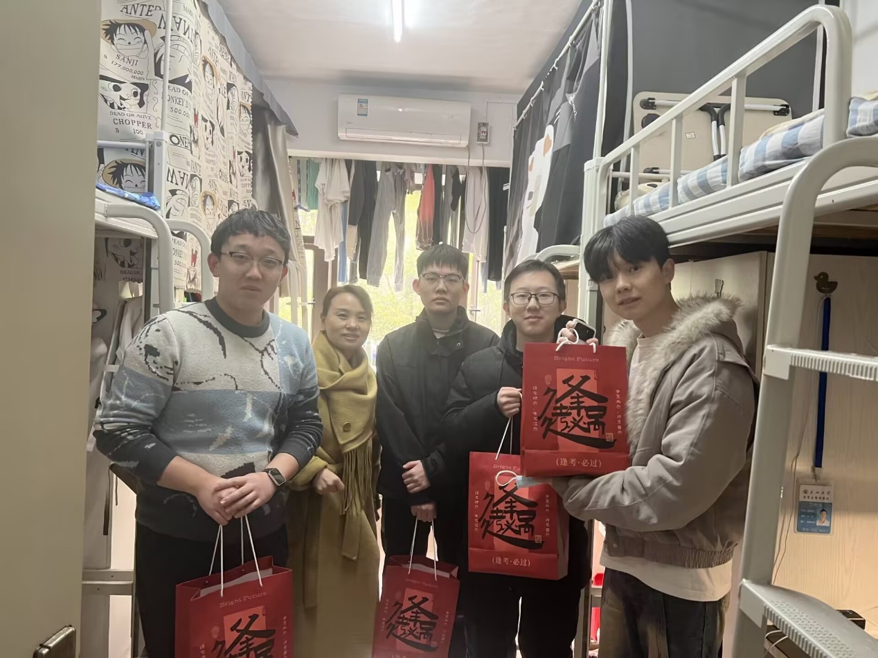 领导、年级辅导员和班主任走访考研学生寝室带着满满的关怀与祝福,将这份充满爱与祝福的“考研大礼包”亲手送到每一位考研学子的手中。