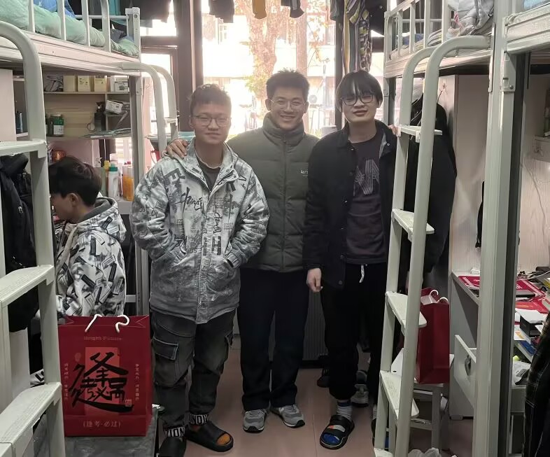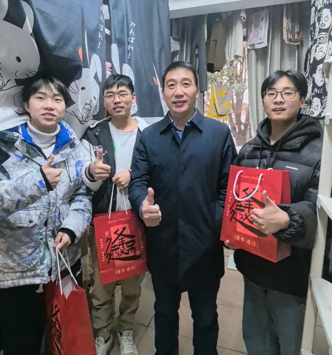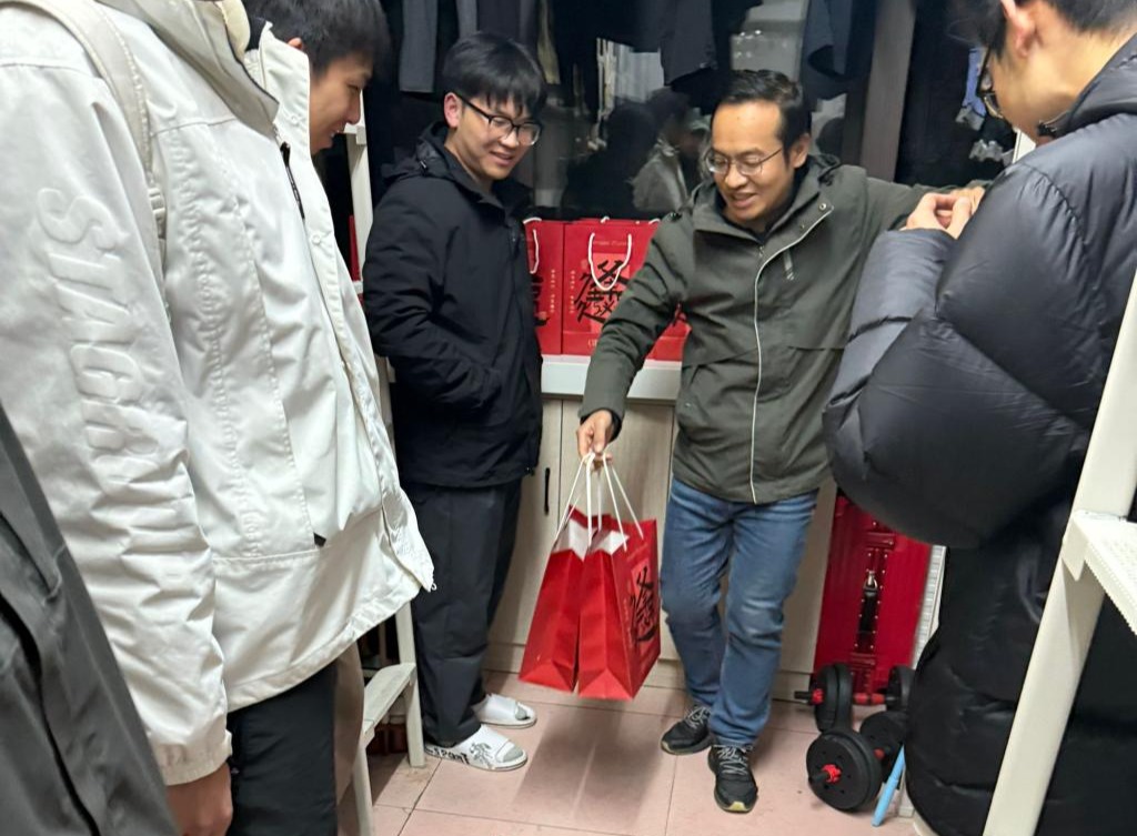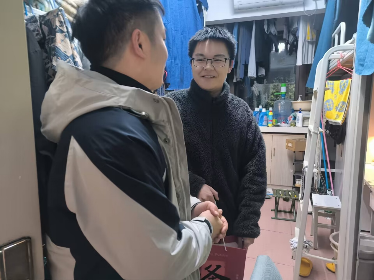 领导、年级辅导员和班主任走访考研学生寝室带着满满的关怀与祝福,将这份充满爱与祝福的“考研大礼包”亲手送到每一位考研学子的手中。