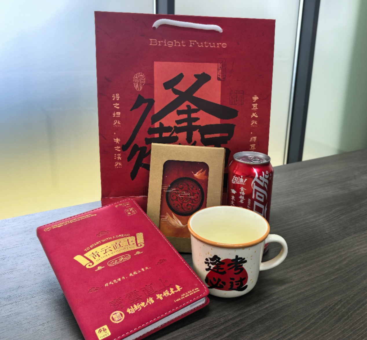 手提袋印制“逢考必过”“成功上岸”等加油语,真诚祝愿每一位考生考试顺利、研途坦荡。红色定制笔记本封面印有工口漫画