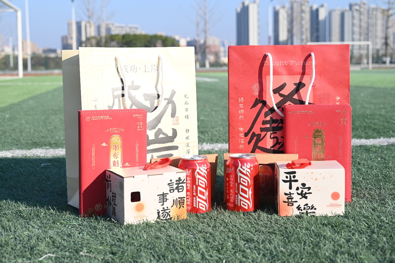logo及“创新电信 智领未来”标语,祝福大家“顶峰相见”。定制版可乐刻印学生姓名以及“金榜题名 乘风破浪”等祝福语,寓意“百事可乐,一切顺利”。“逢考必过”幸运杯祝福考研学子诸事顺遂,一战成硕。另外还精心挑选了10张荆州博物馆联名的明信片,祝福大家成功上岸。
