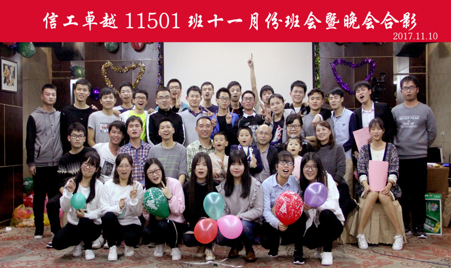 信工卓越11501班,一个由30人组成的追求上进,团结友爱,具有强凝聚力的班集体。现有男生22人,女生8人,在这个班级里面,每位同学都是重要的一员。在班主任阮宁君老师的指导下,在班委会的带领下,我们班在思想引领、学习创新、组织运行等各方面都取得了可喜成绩。